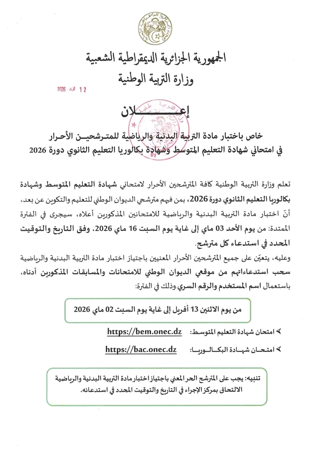 ودعت جميع المترشحين الأحرار المعنيين باجتياز اختبار مادة الرياضة سحب استدعاءاتهم من موقعي الديوان الوطني للامتحانات والمسابقات المذكورين أدناه باستعمال اسم المستخدم والرقم السري وذلك في الفترة من يوم الاثنين 13 أفريل إلى غاية يوم السبت 02 ماي 2026