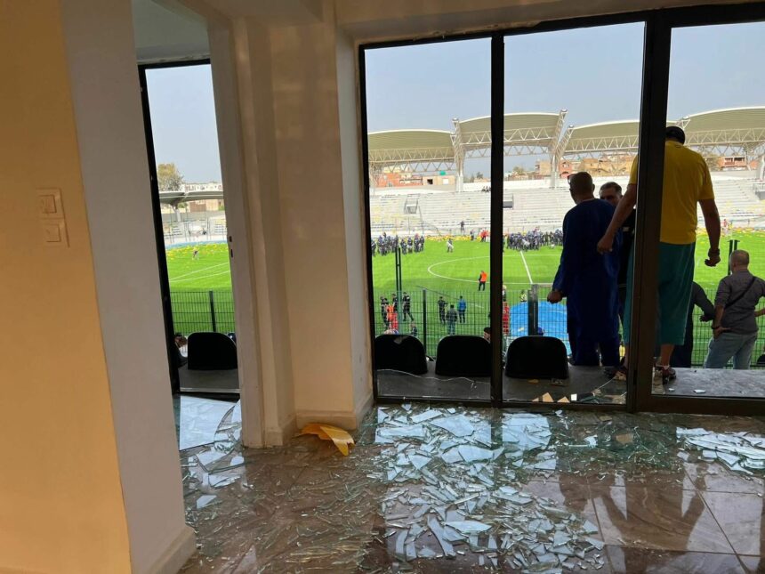 كما شملت أعمال العنف تحطيم زجاج النوافذ، قبل محاولة عدد من المشجعين اقتحام أرضية الميدان باستعمال القوة، ما تسبب في حالة فوضى داخل المنشأة الرياضية.